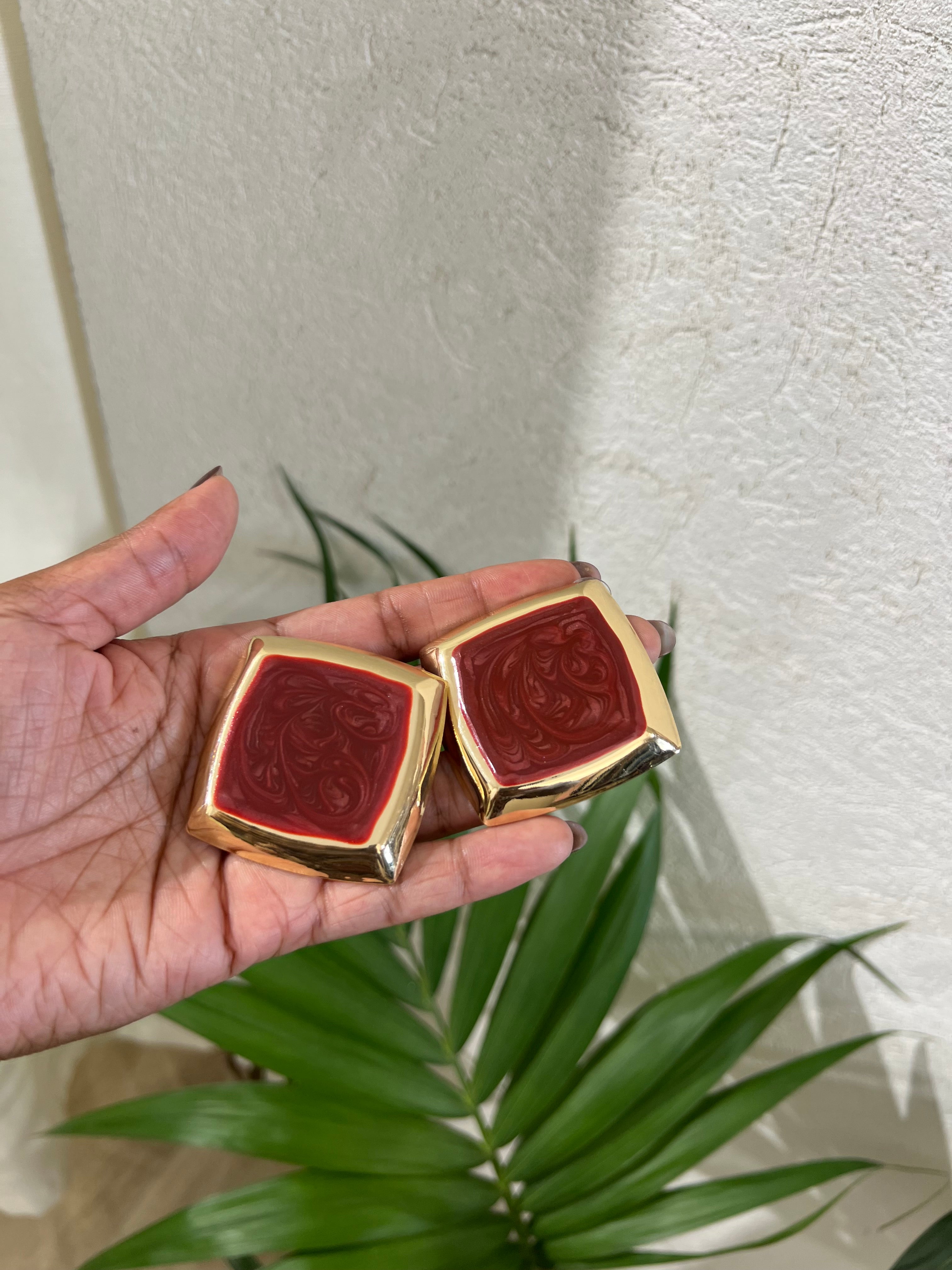 Orecchìni in materiale ipoallergenico . chiusura a farfalla, forma quadrata con interno vernice rosso