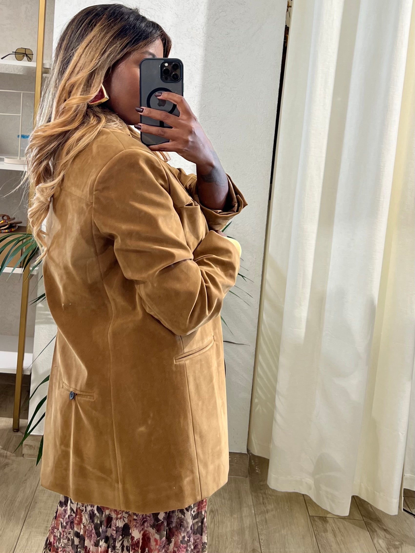 Giacca in suede con spalline rinforzate , foderata internamente con chiusura a bottoni e tasche filo laterali, sul retro presenta soacchetti laterali e tasca .