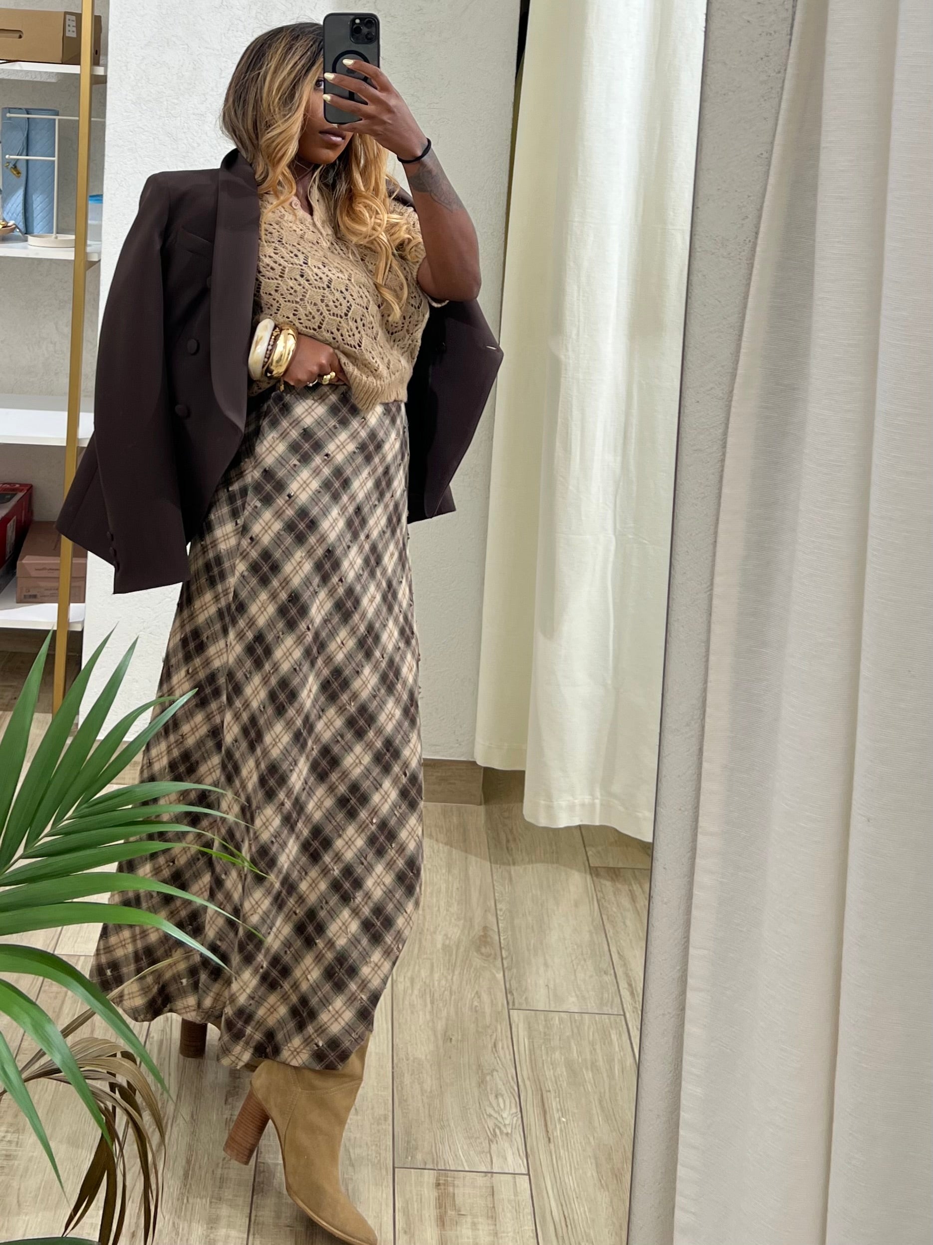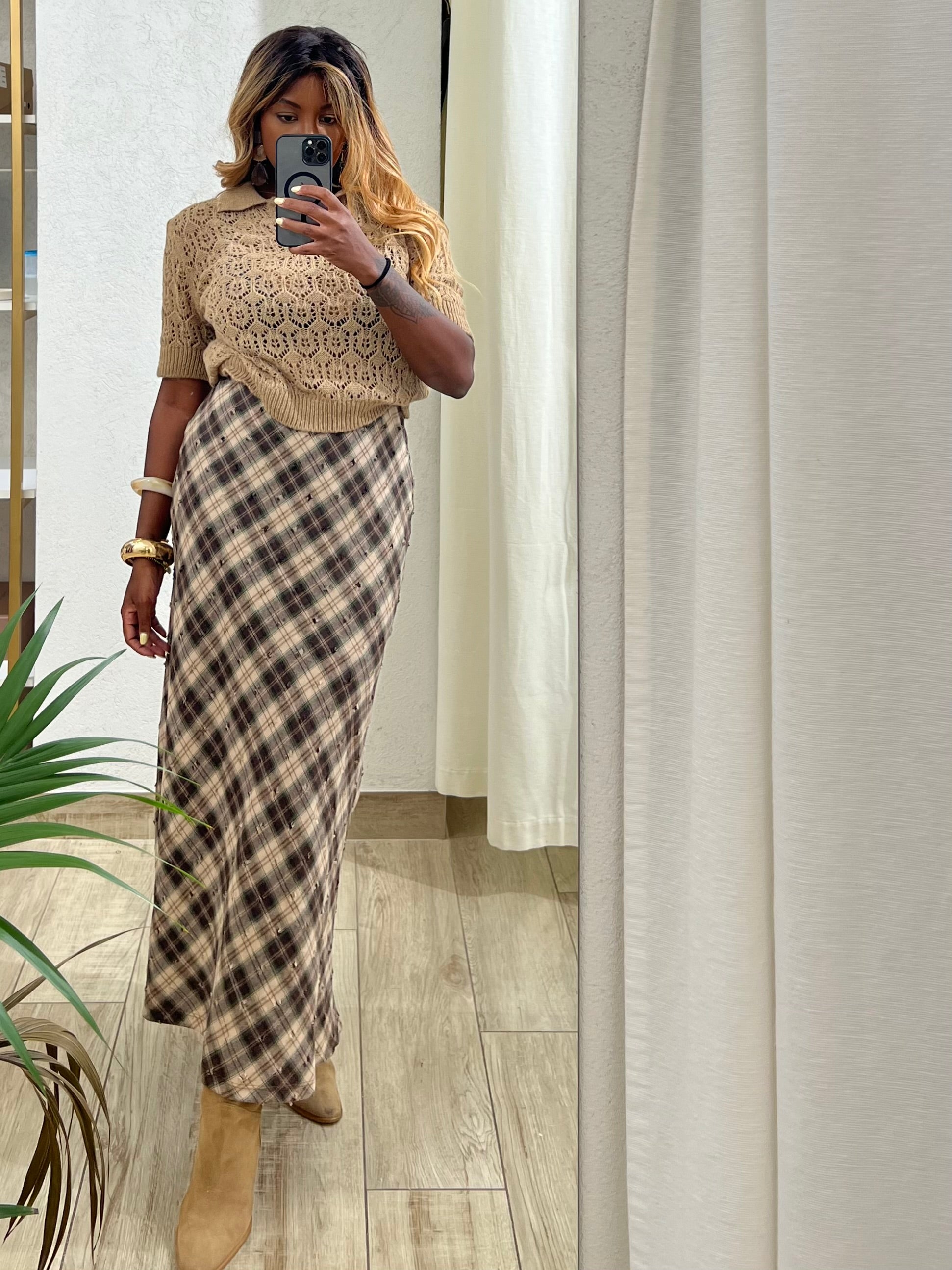 Gonna con elastico in vita , modello slim con lunghezza midi , trama con stampa a righe e tessuto elasticizzato.