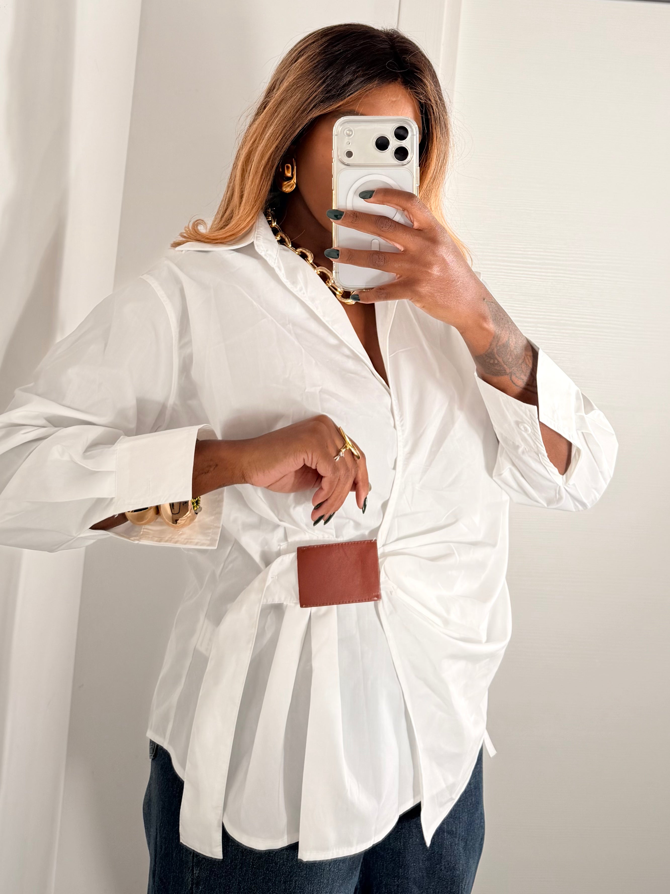Rivisitazione moderna di un classico, questa camicia di cotone bianco presenta una vestibilità oversize e maniche lunghe con polsini strutturati. Il punto focale è il dettaglio sartoriale in vita: un cinturino/ patta in ecopelle marrone a contrasto che increspa il tessuto sul davanti, permettendo di regolare la vestibilità e di creare un effetto drappeggiato e aderente al corpo. Ideale per un look sofisticato e di tendenza.
