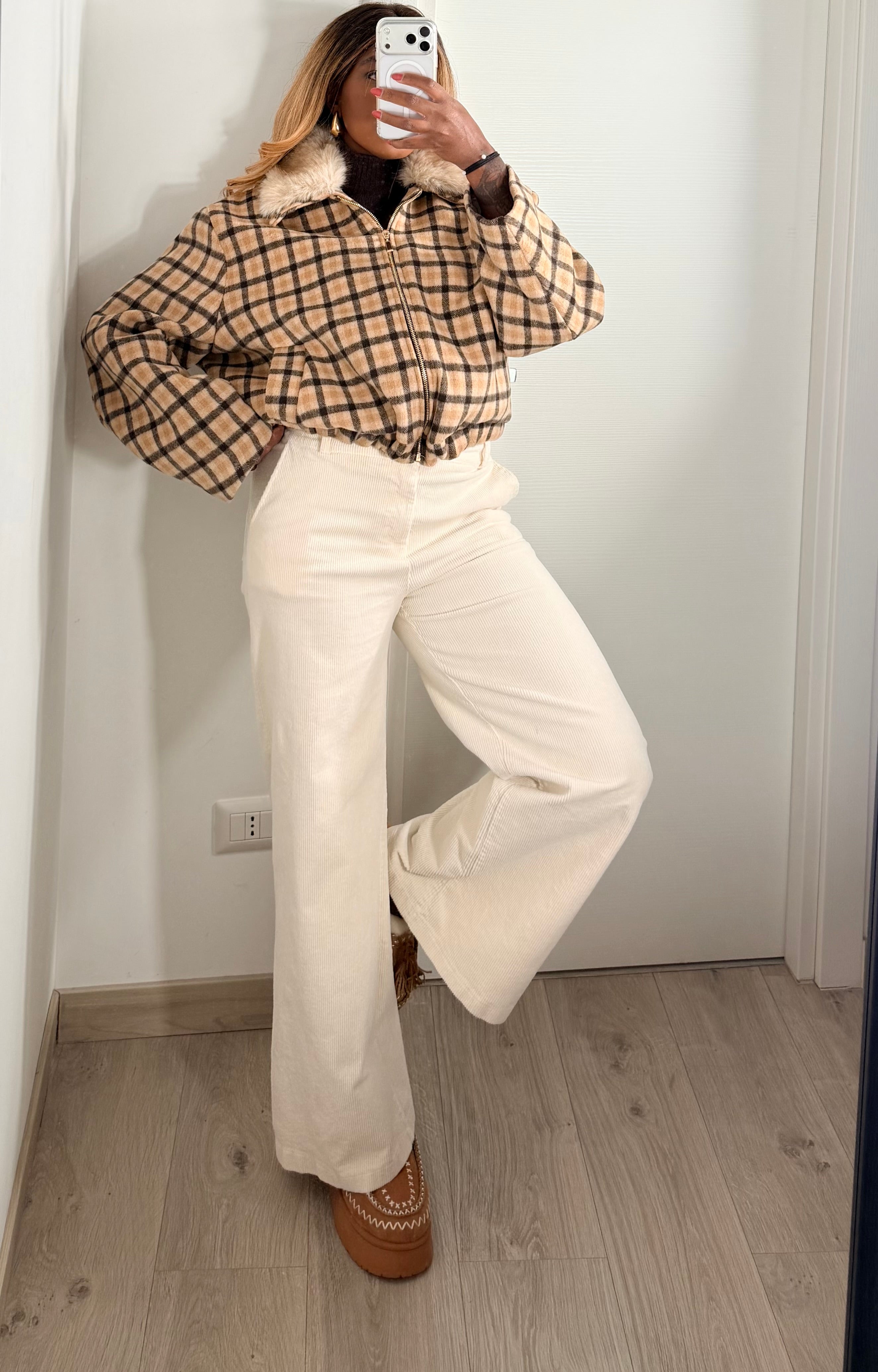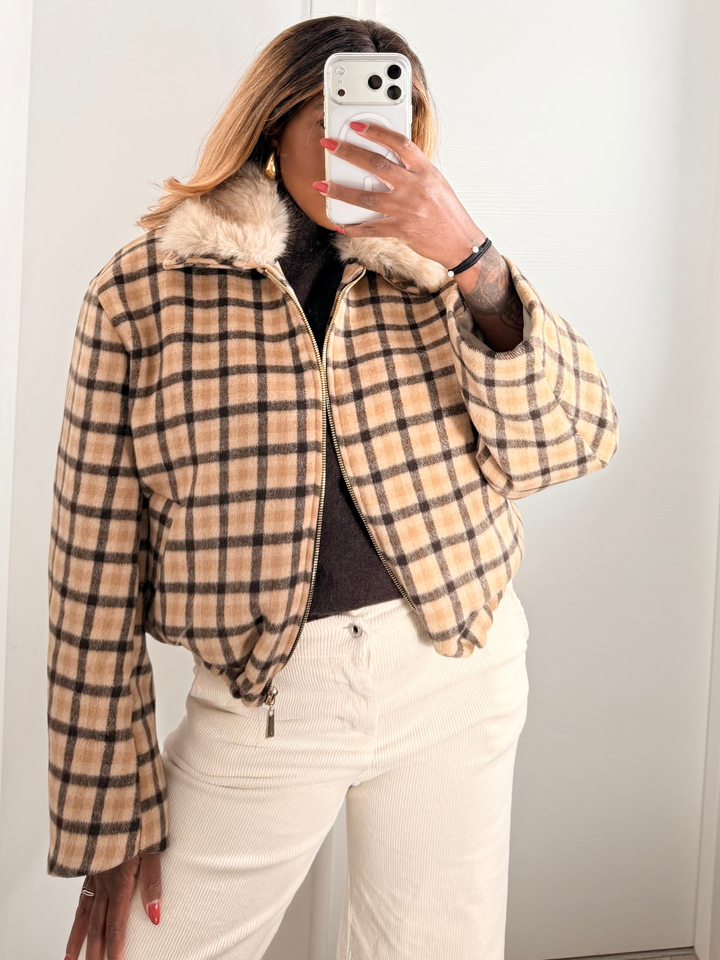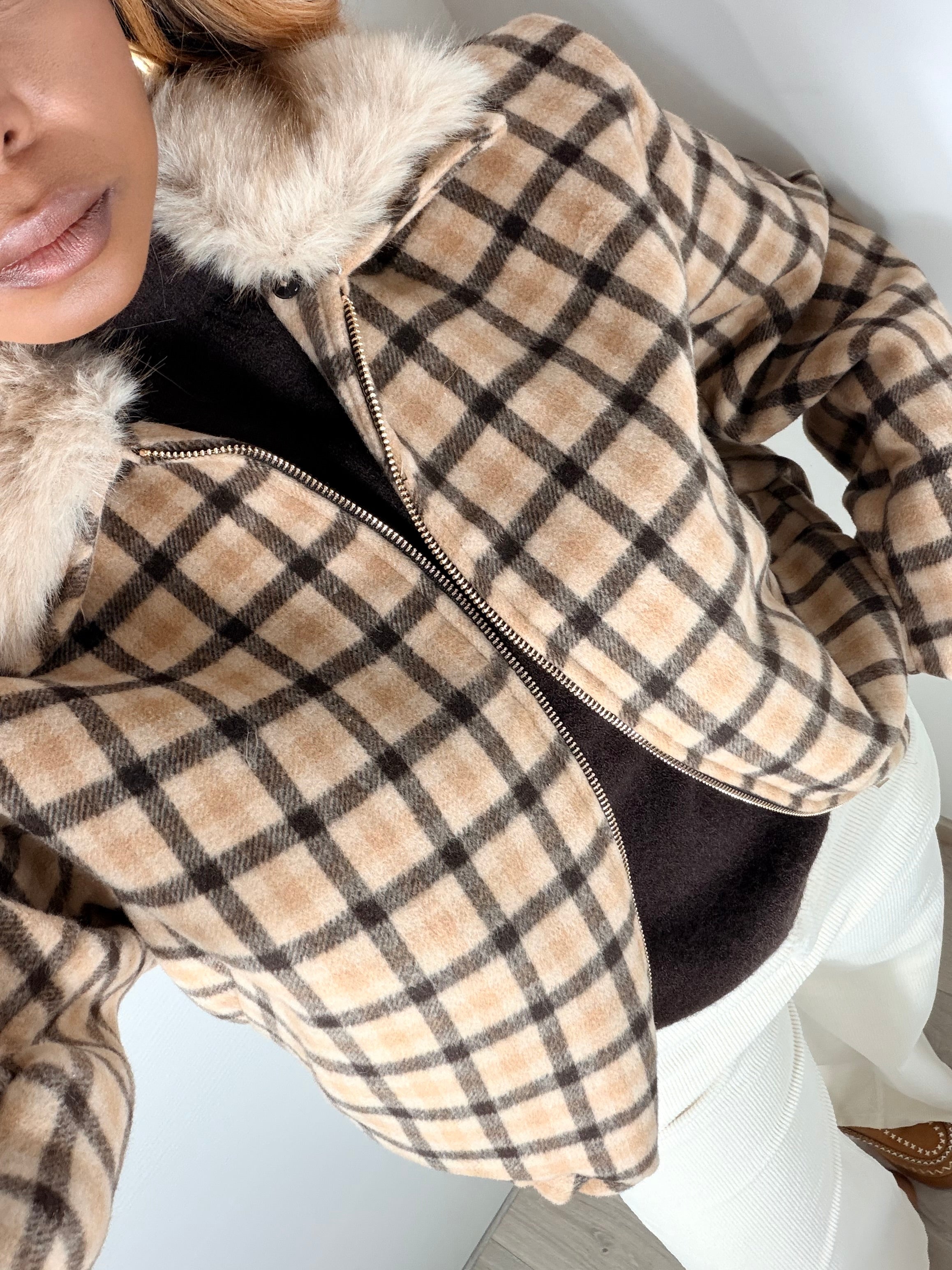 Bomber dal design contemporaneo con fantasia a quadri tartan nei toni del beige, marrone e nero per un look subito riconoscibile e versatile. Sul fondo presenta un’arricciatura che enfatizza la sua struttura e Il collo è in pelliccia ecologica di media lunghezza, rimovibile.