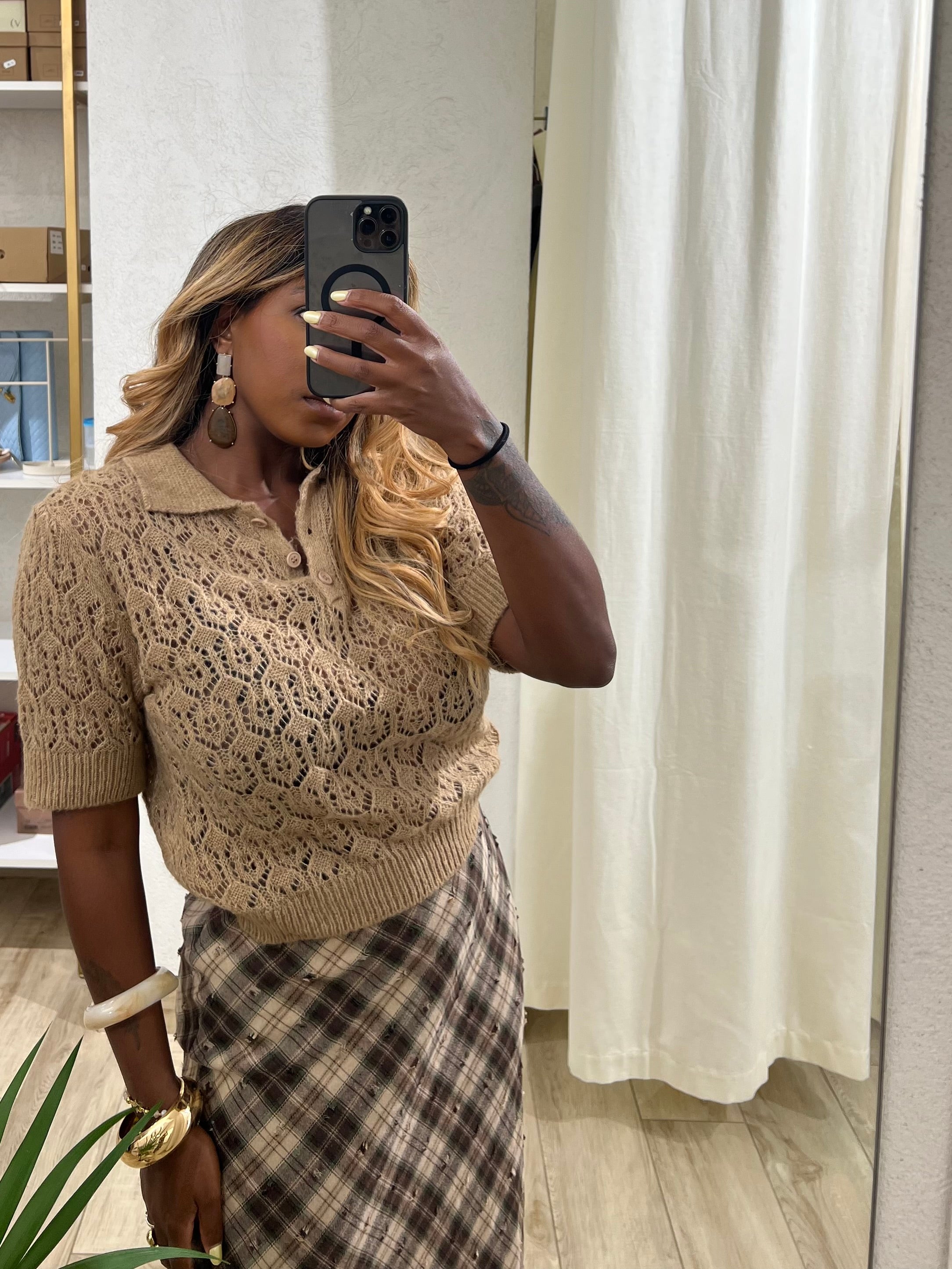 Polo maniche corte in lana e viscosa traforata , con colletto e chiusura con bottoni tono su tono.