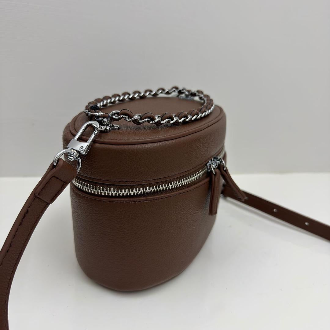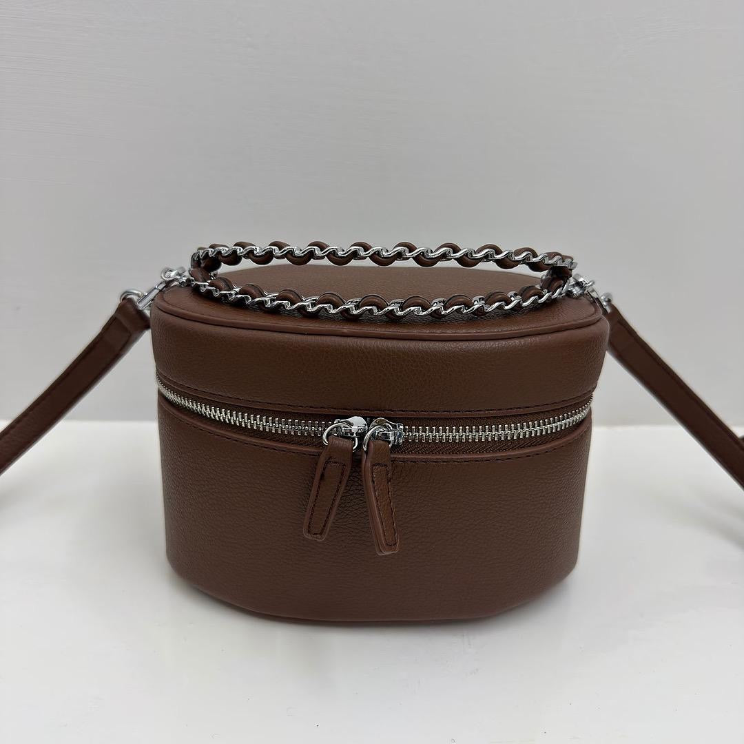 La borsa Vanity e’ realizzata in ecopelle con chiusura a zip e doppio manico intrecciato in ecopelle e metallo argento .