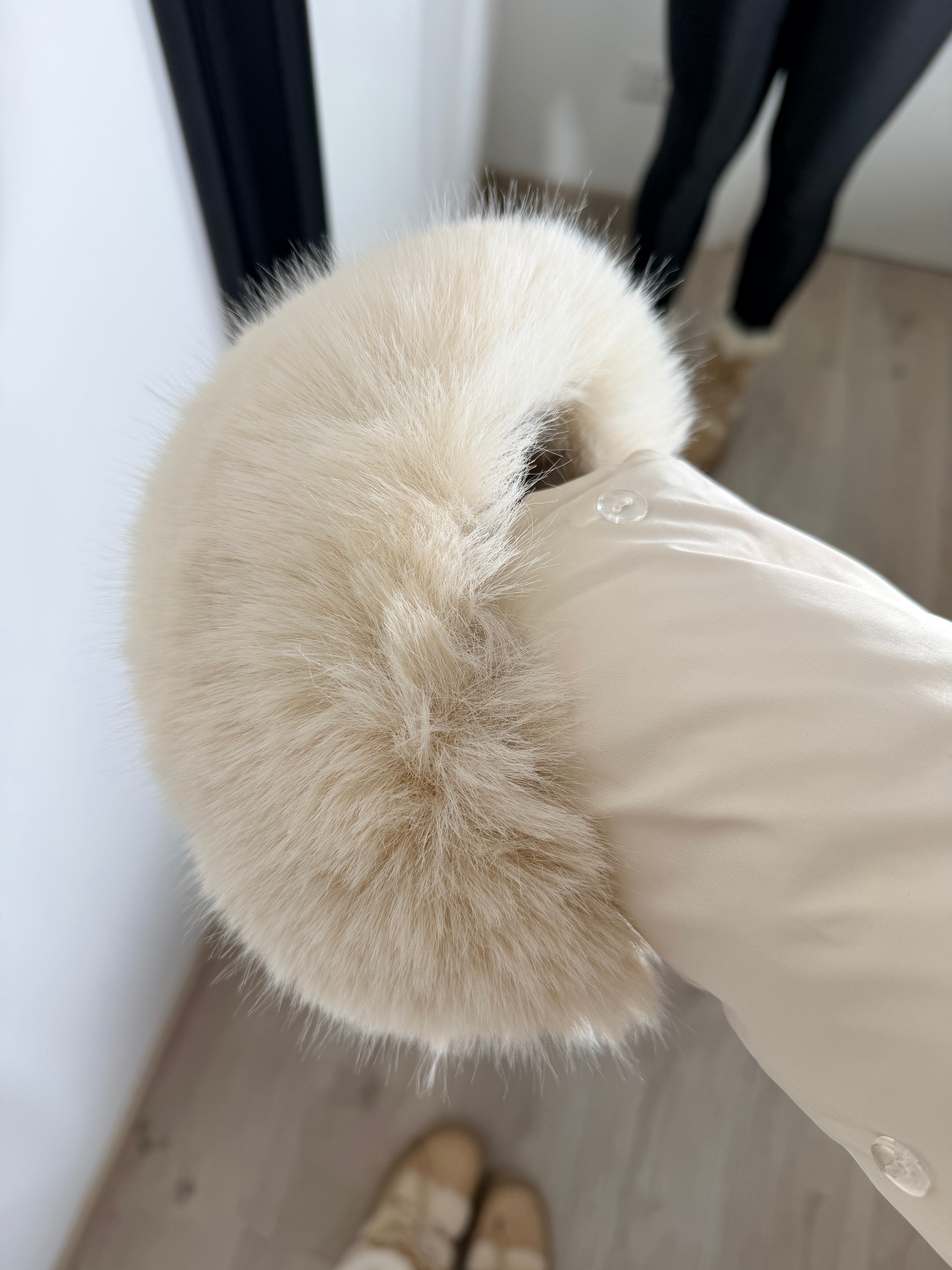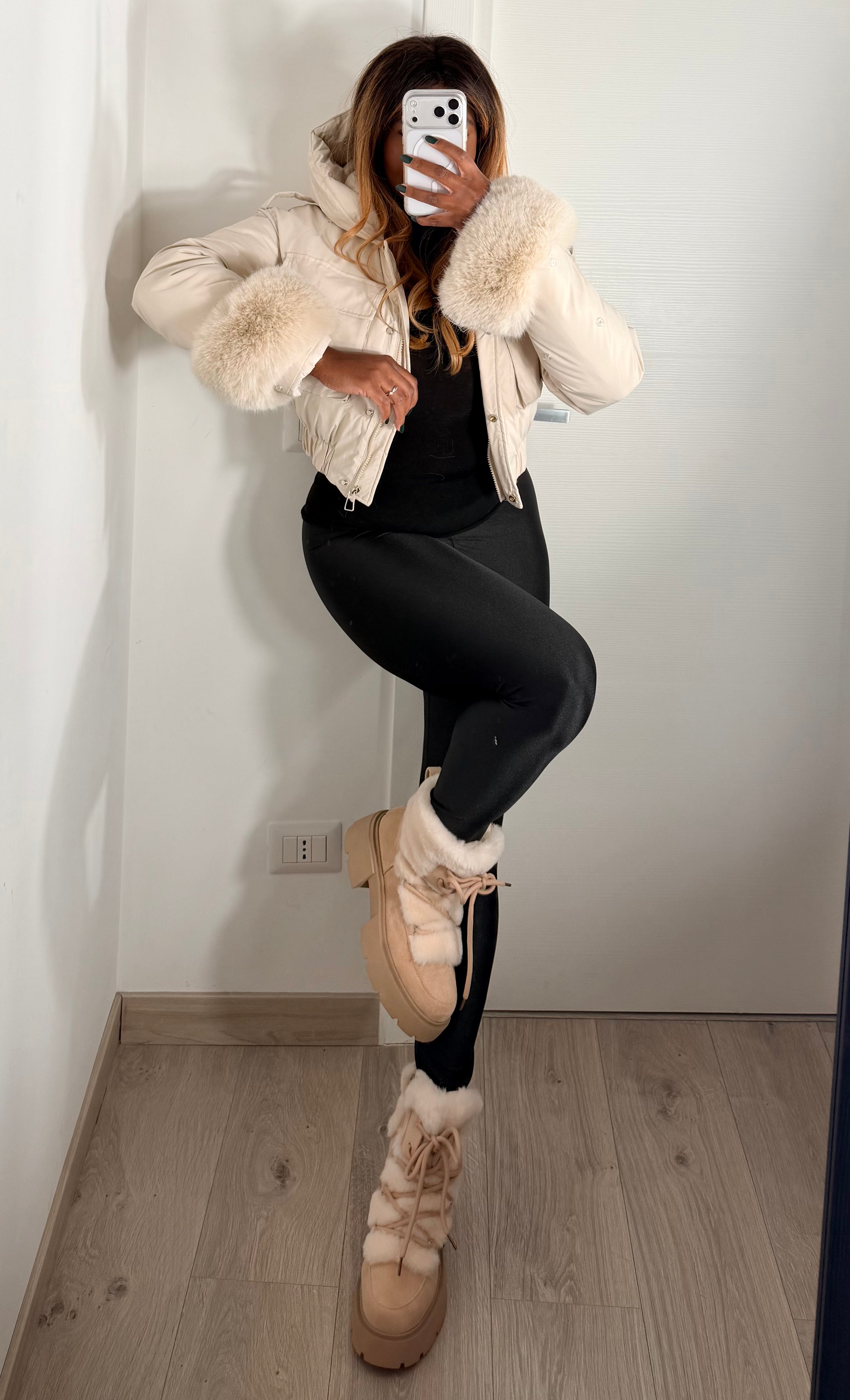 Giubbino caratterizzato da una lunghezza crop e valorizzato da una voluminosa ecopelliccia color panna/beige chiaro che incornicia il collo e i polsini (entrambi rimovibili). La pelliccia aggiunge un tocco glamour, mentre l'imbottitura assicura massimo isolamento.