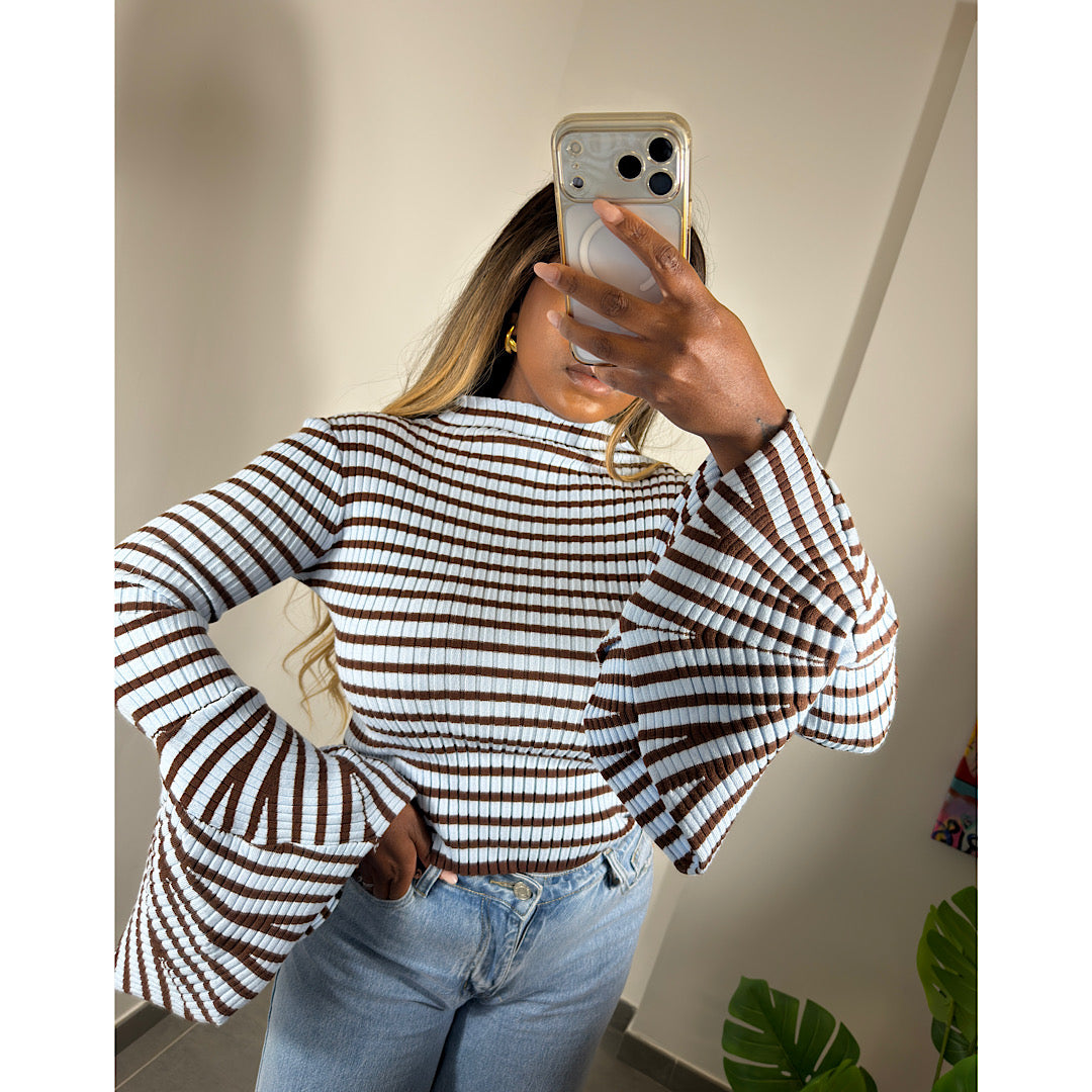 Il capo presenta una fantasia a righe bordeaux su base rosa, dal contrasto definito e moderno. Le maniche sono rifinite con dettaglio asimmetrico sul polso, elemento distintivo che valorizza il design.