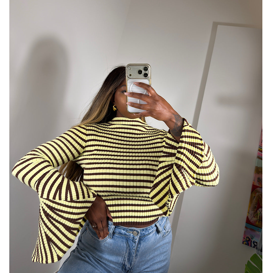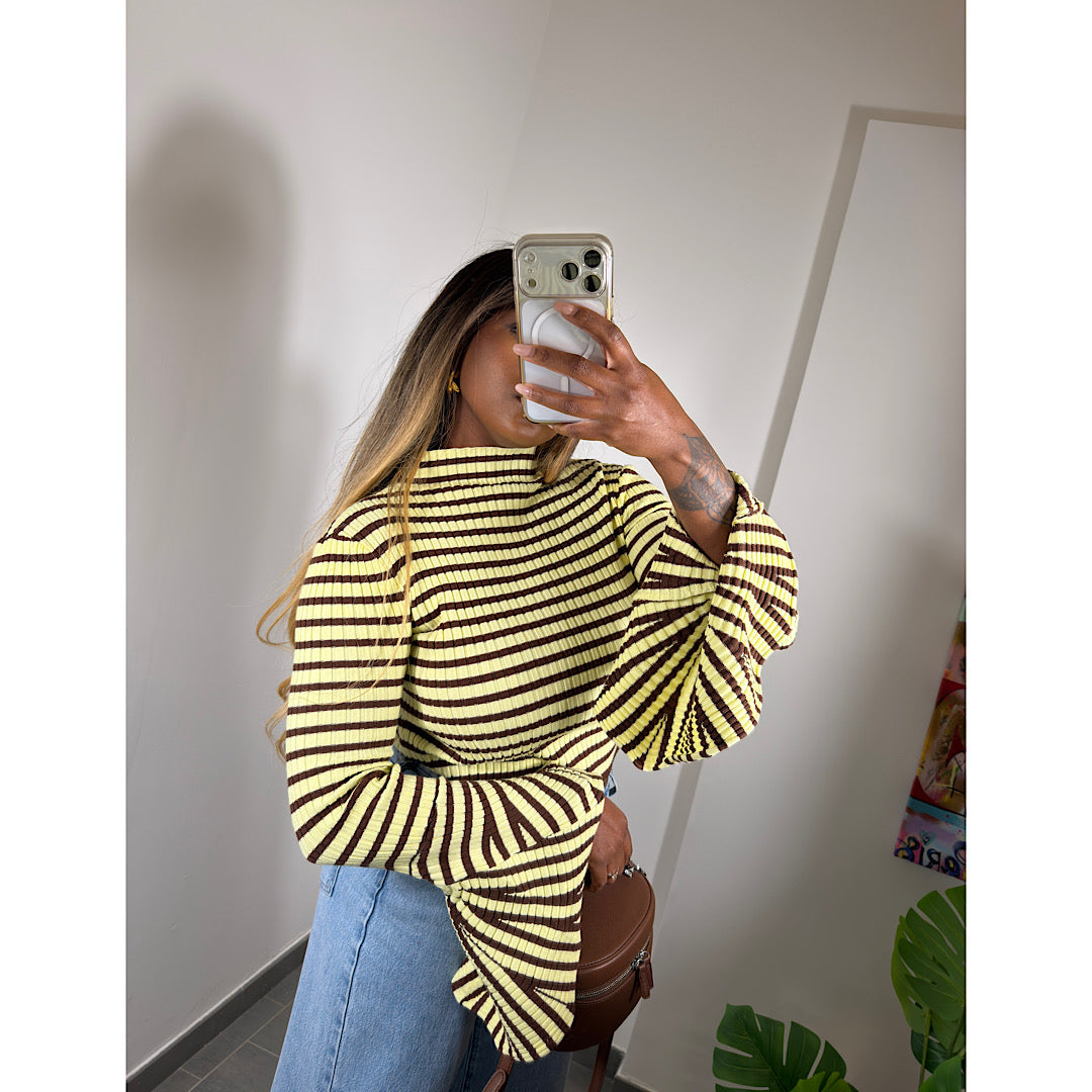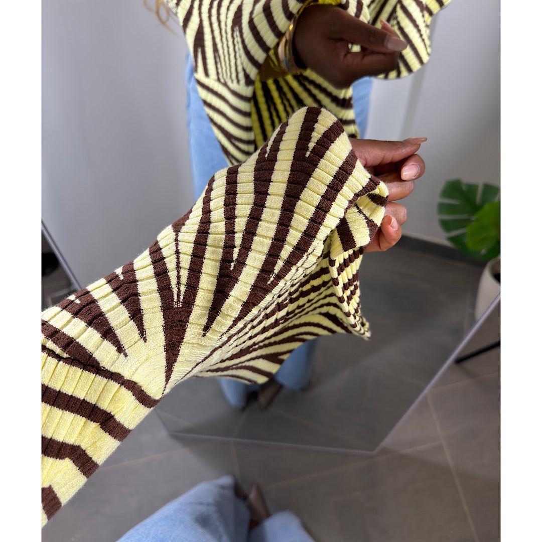 Il capo presenta una fantasia a righe marrone su base rgialla, dal contrasto definito e moderno. Le maniche sono rifinite con dettaglio asimmetrico sul polso, elemento distintivo che valorizza il design.