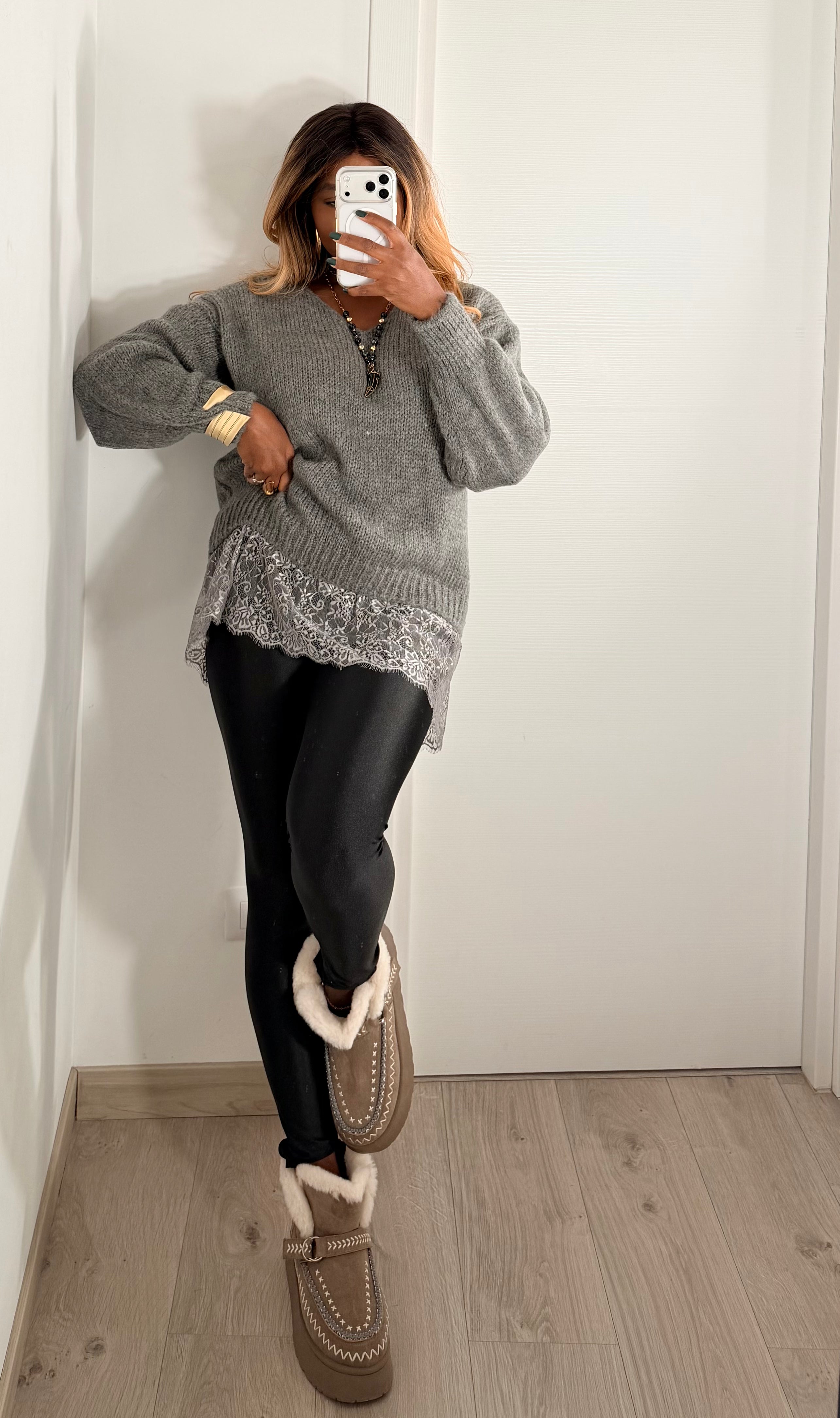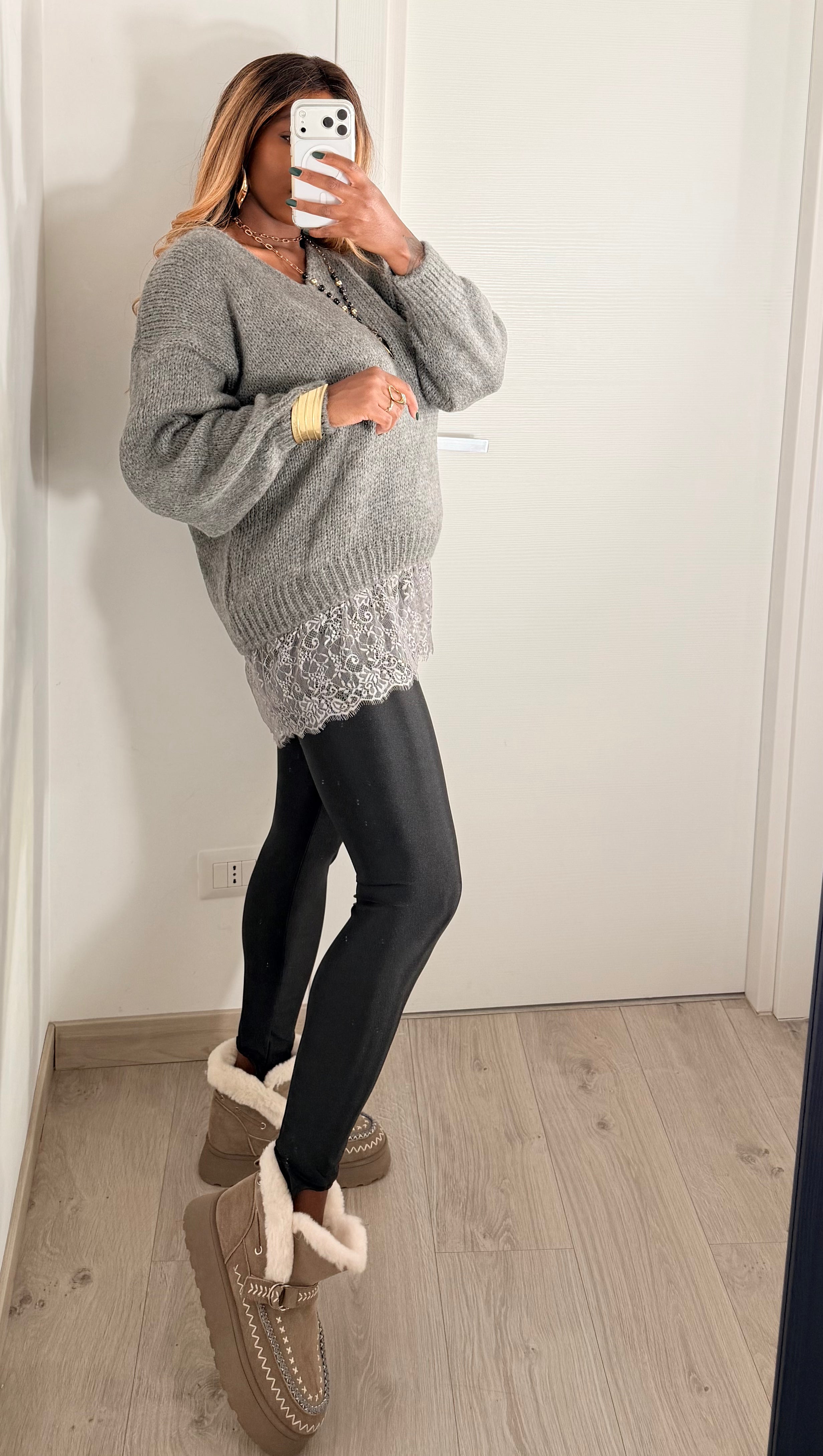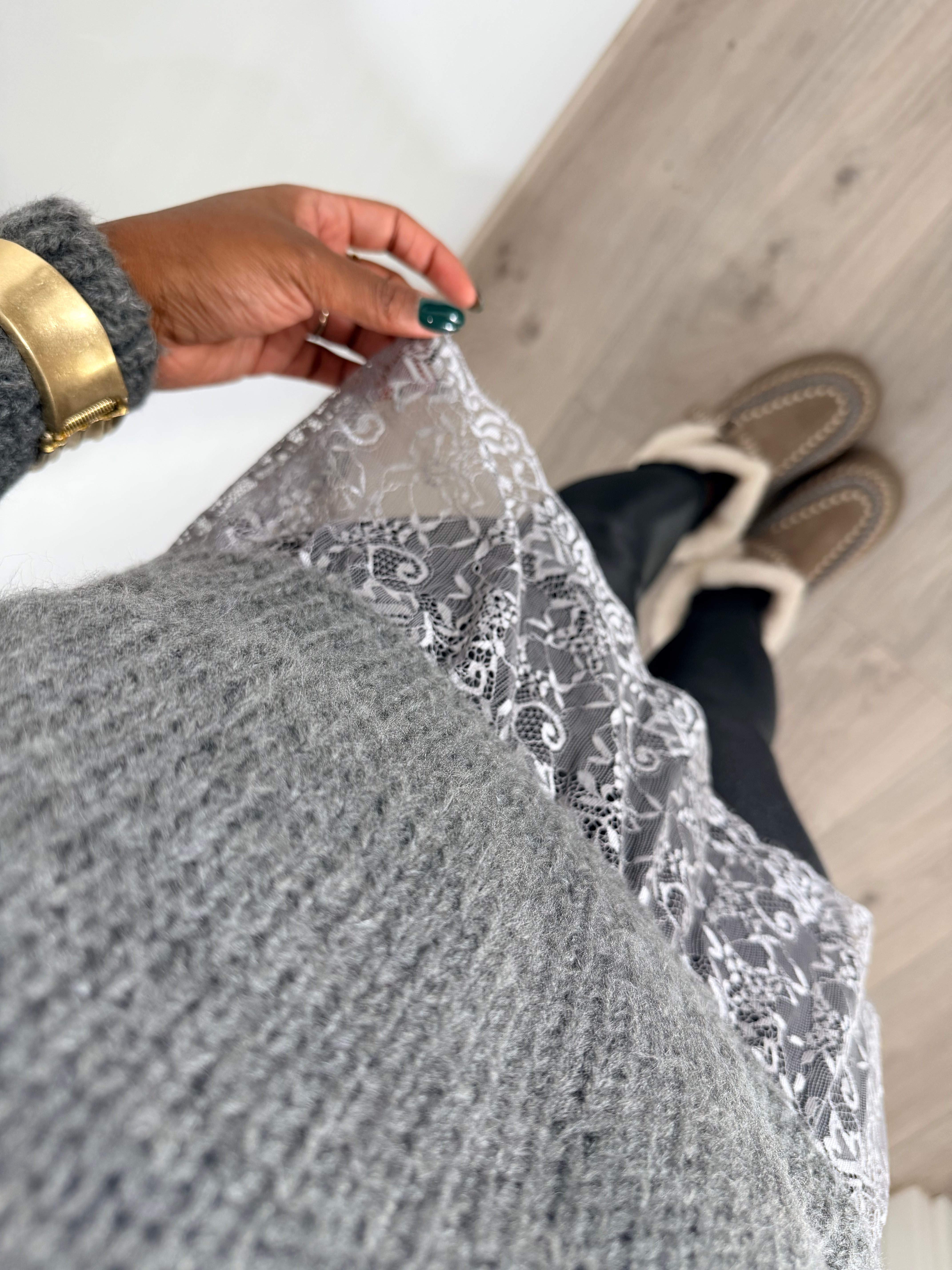 Un maglione versatile che unisce morbidezza e femminilità. Questo modello in maglia grossa grigia con scollo a V offre una vestibilità oversize e rilassata. Il tocco distintivo è l'effetto layering creato dal bordo in pizzo che fuoriesce dall'orlo, aggiungendo un dettaglio romantico e raffinato. Perfetto per outfit caldi ma sofisticati.