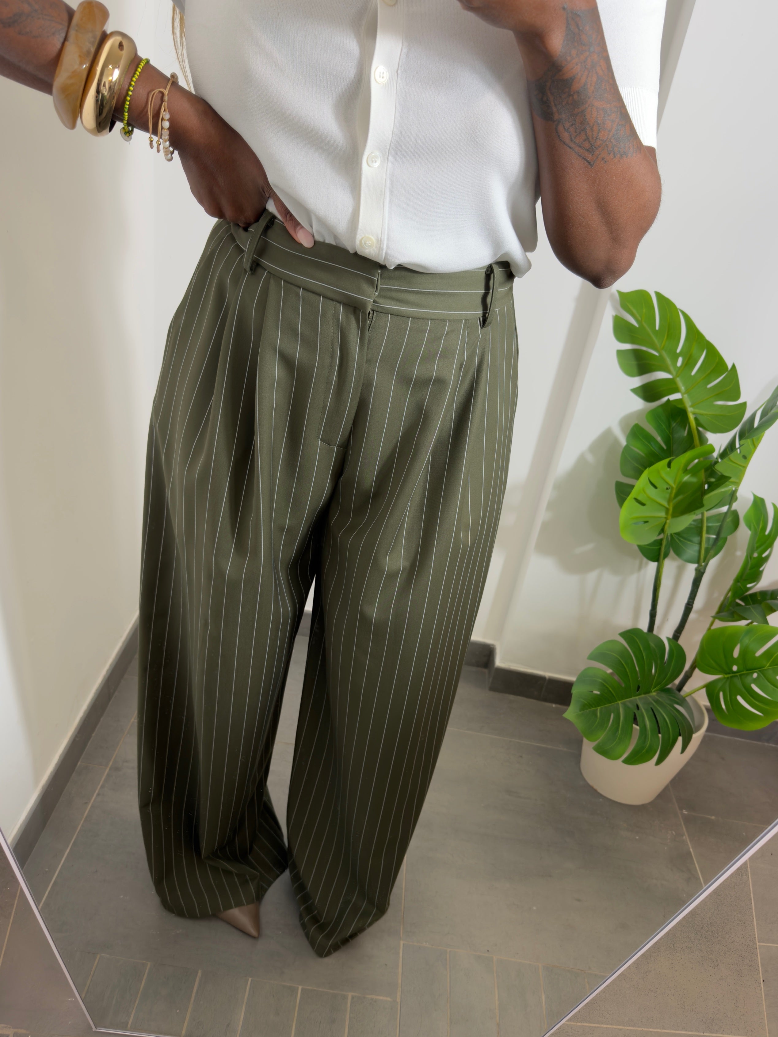 Il pantalone a vita alta completa il completo con una linea elegante e fluida. Dotato di tasche a filo e gamba ampia e morbida, assicura movimento e raffinatezza ad ogni passo.