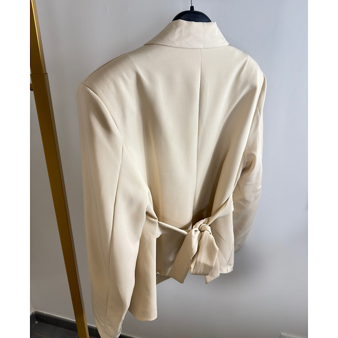 La giacca presenta spalline rinforzate che valorizzano la linea delle spalle, chiusura a doppio petto con bottoni e drappeggio frontale che dona movimento al design. Il modello è completato da stringatura regolabile sui fianchi, che permette di adattare il capo alla silhouette e definire il punto vita.
