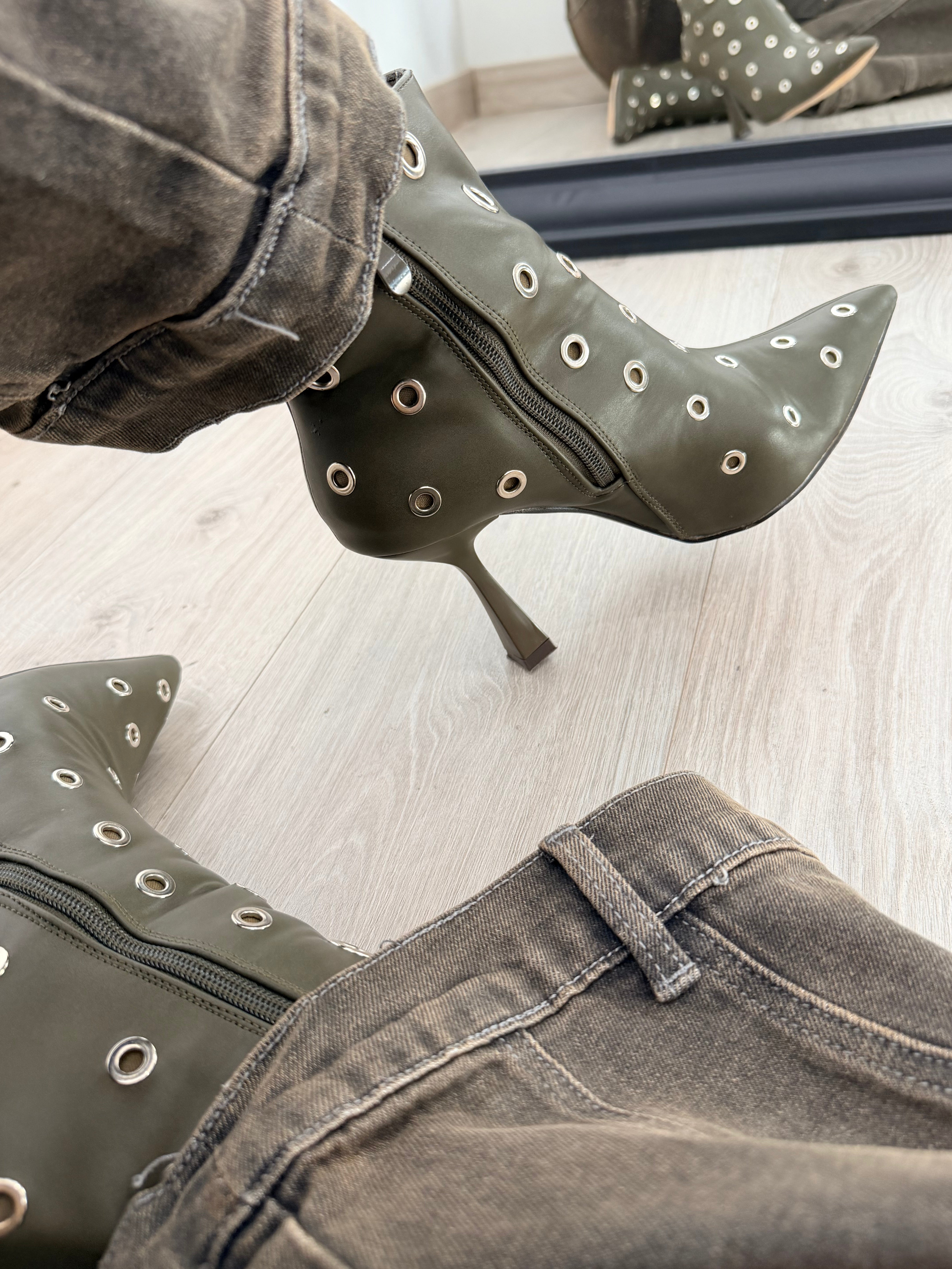 Stivaletto con tomaia è interamente decorata con occhielli metallici argentati, che creano un motivo distintivo e grintoso, foderato internamente. Presentano una silhouette affusolata con una punta affilata e un tacco a spillo stiletto che slancia la figura. La pratica zip laterale ne facilita la calzata. Il colore verde militare/oliva scuro li rende un pezzo di tendenza e versatile.