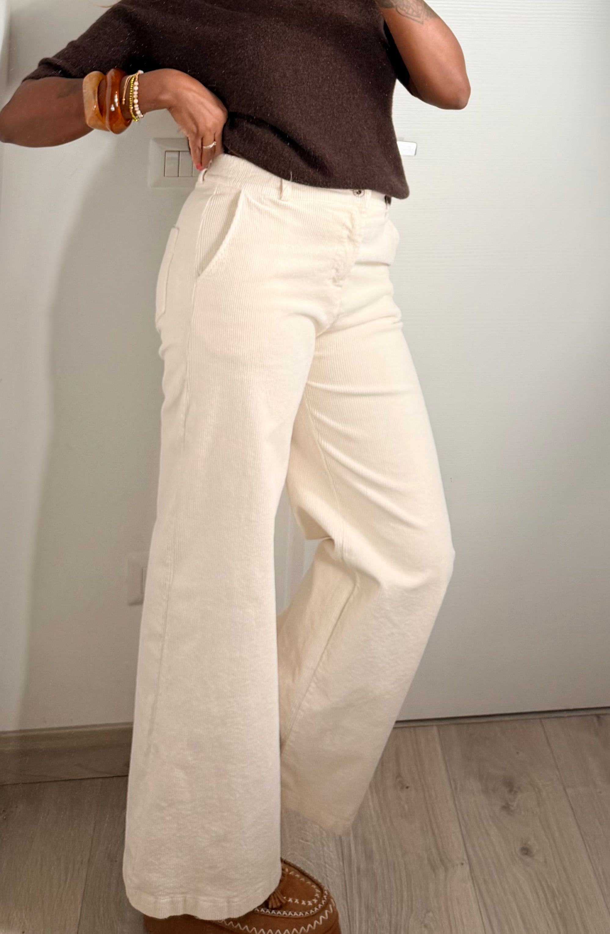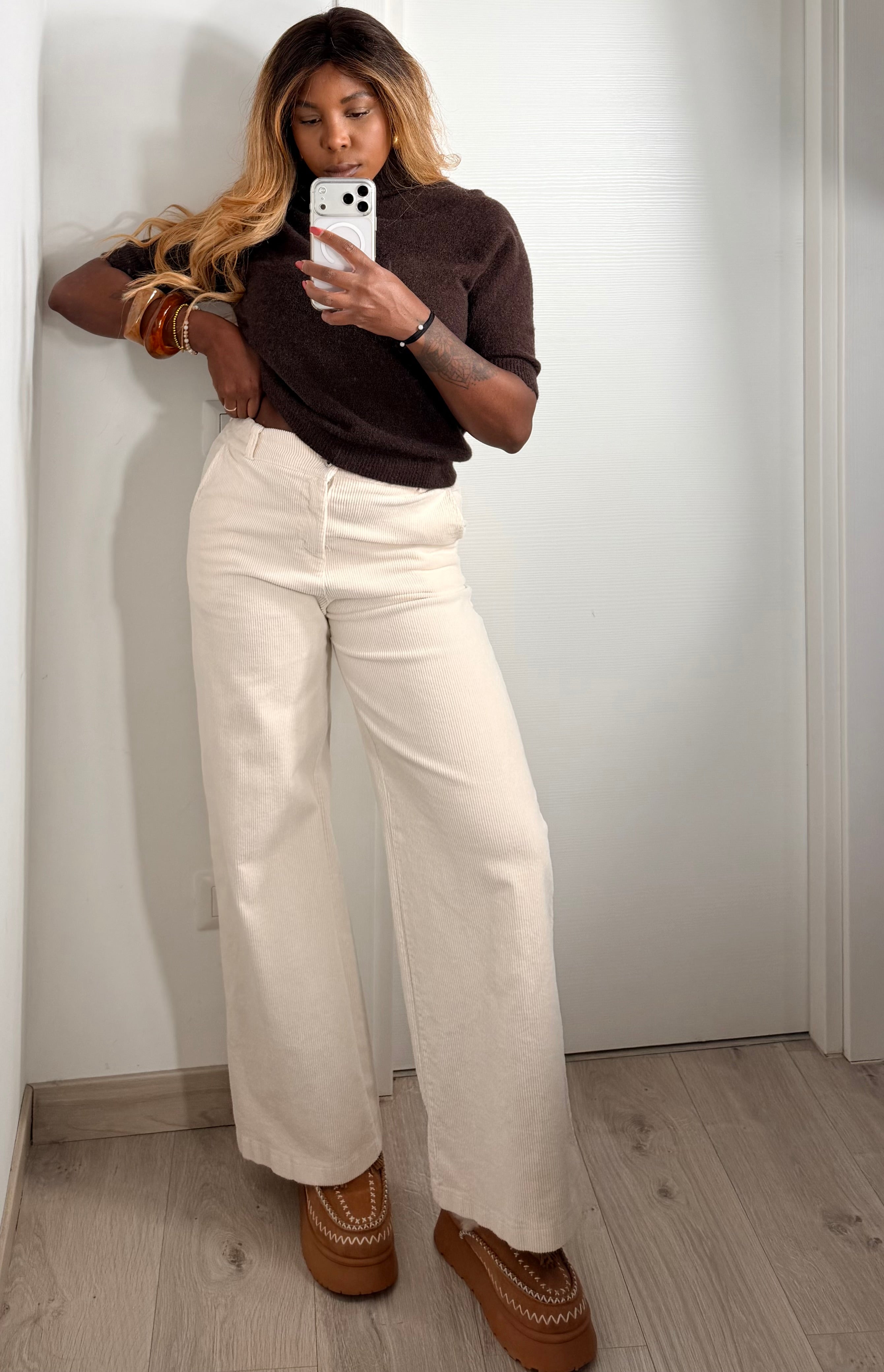 Morbido pantalone wide leg in velluto a coste con elastico in vita e chiusura a bottone. Il tessuto strutturato aggiunge calore e una texture ricca, ideale per la stagione fredda. La gamba larga offre una vestibilità comoda e casual per una silhouette super trendy.