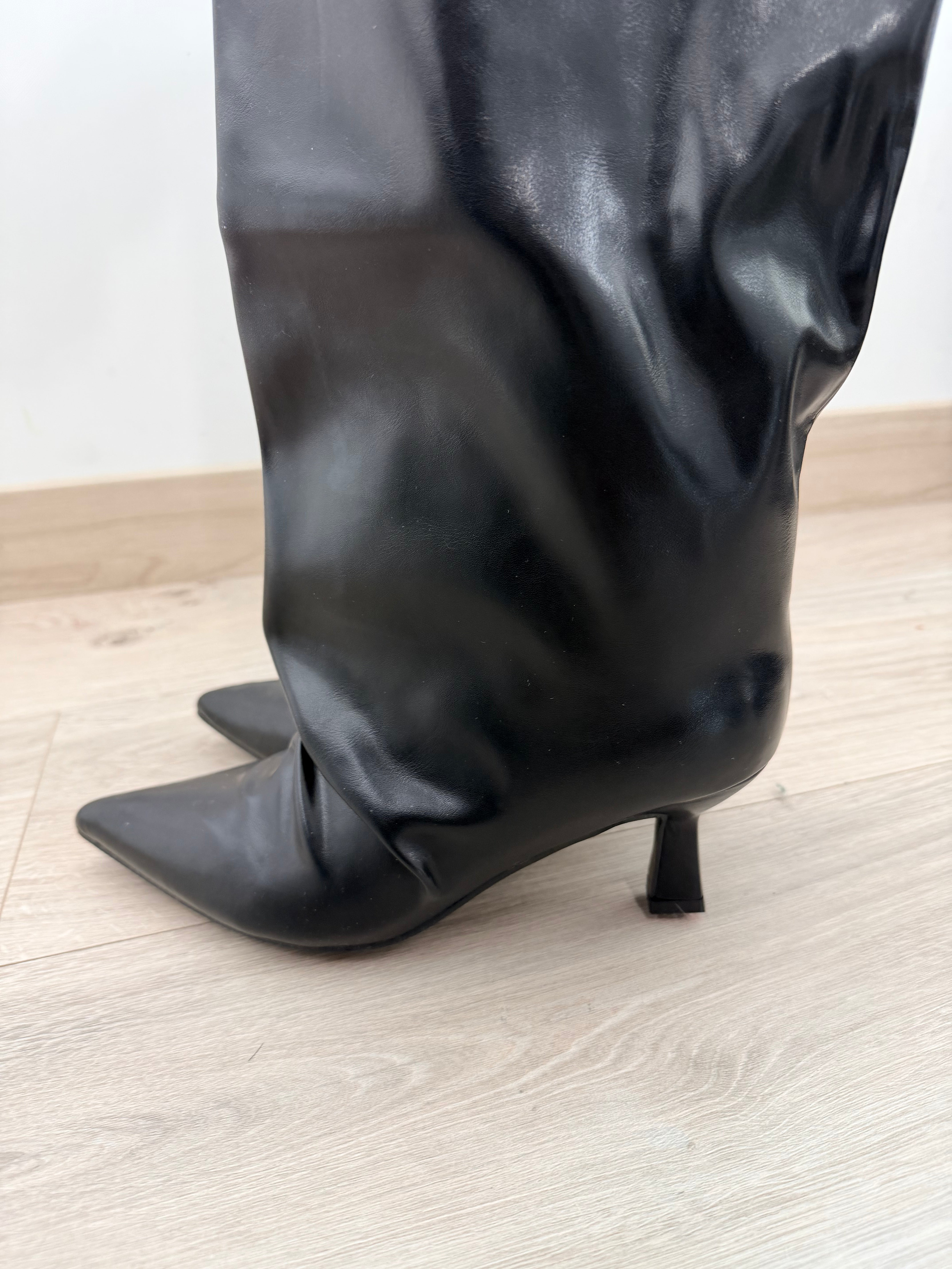 Vali neri on ecopelle effetto lucido foderato internamente, dal design elegante e femminile. Modello a punta con tacco a rocchetto 4 cm e gambale largo leggermente arricciato per un look moderno e slanciato. Ideale per outfit serali o per dare in tocco di glamour al quotidiano.