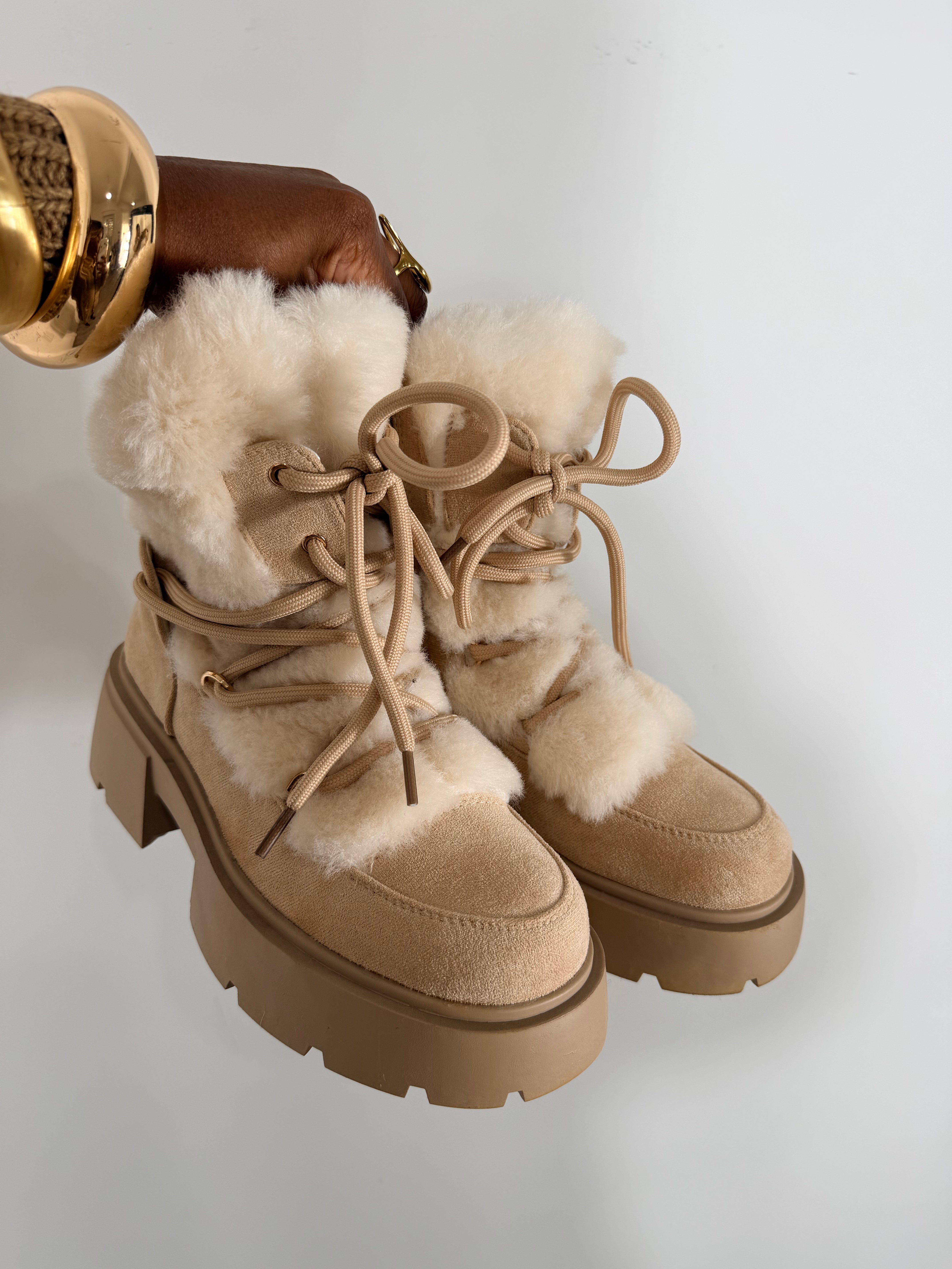 Stivale Teddy con la tomaia che combina un morbido materiale effetto suede color cammello con dettagli in eco-pelliccia color panna per un look caldo e avvolgente. Sono dotati di robusti lacci in corda e una suola platform carrarmato spessa che assicura aderenza e isolamento dal terreno.