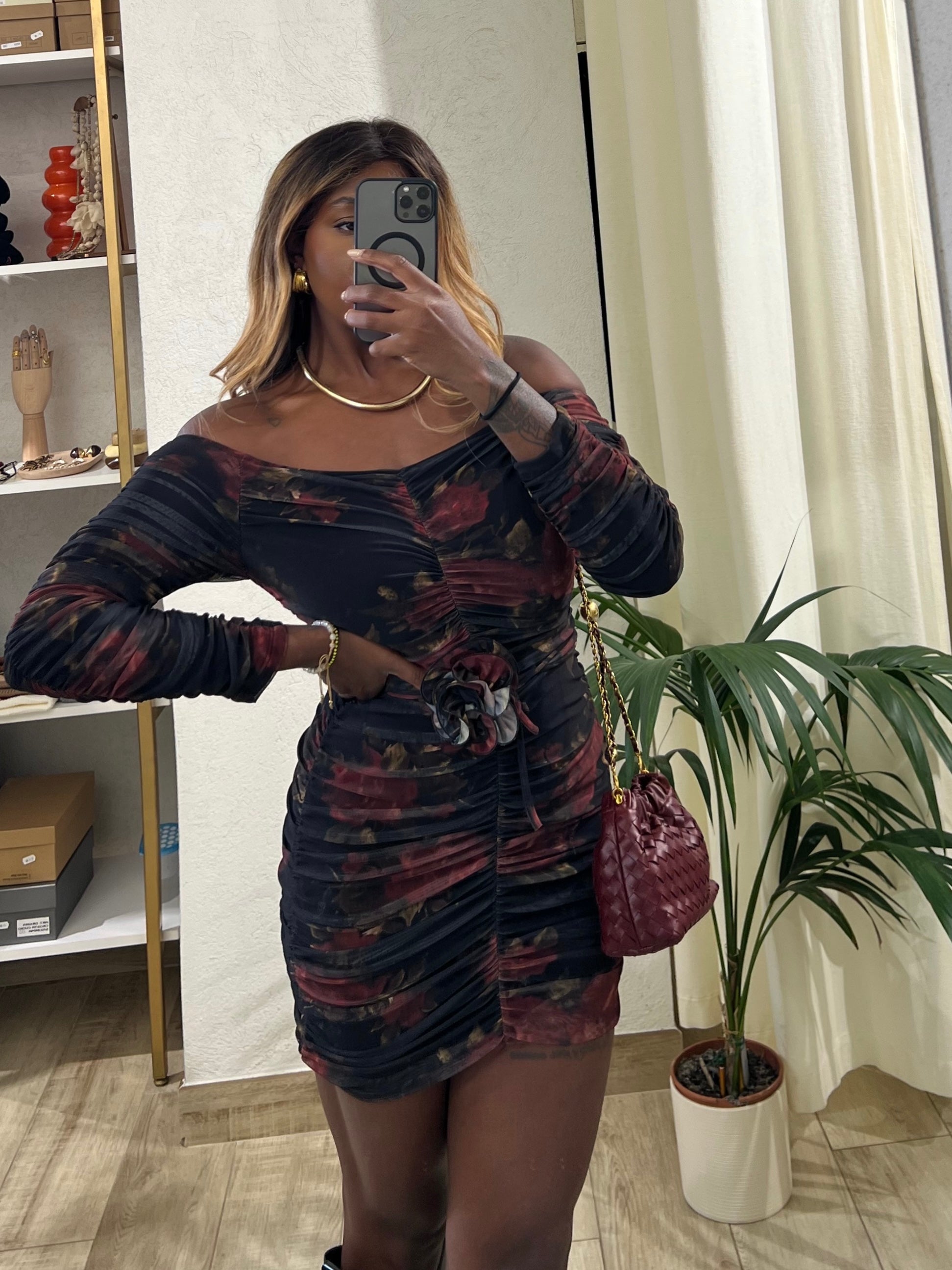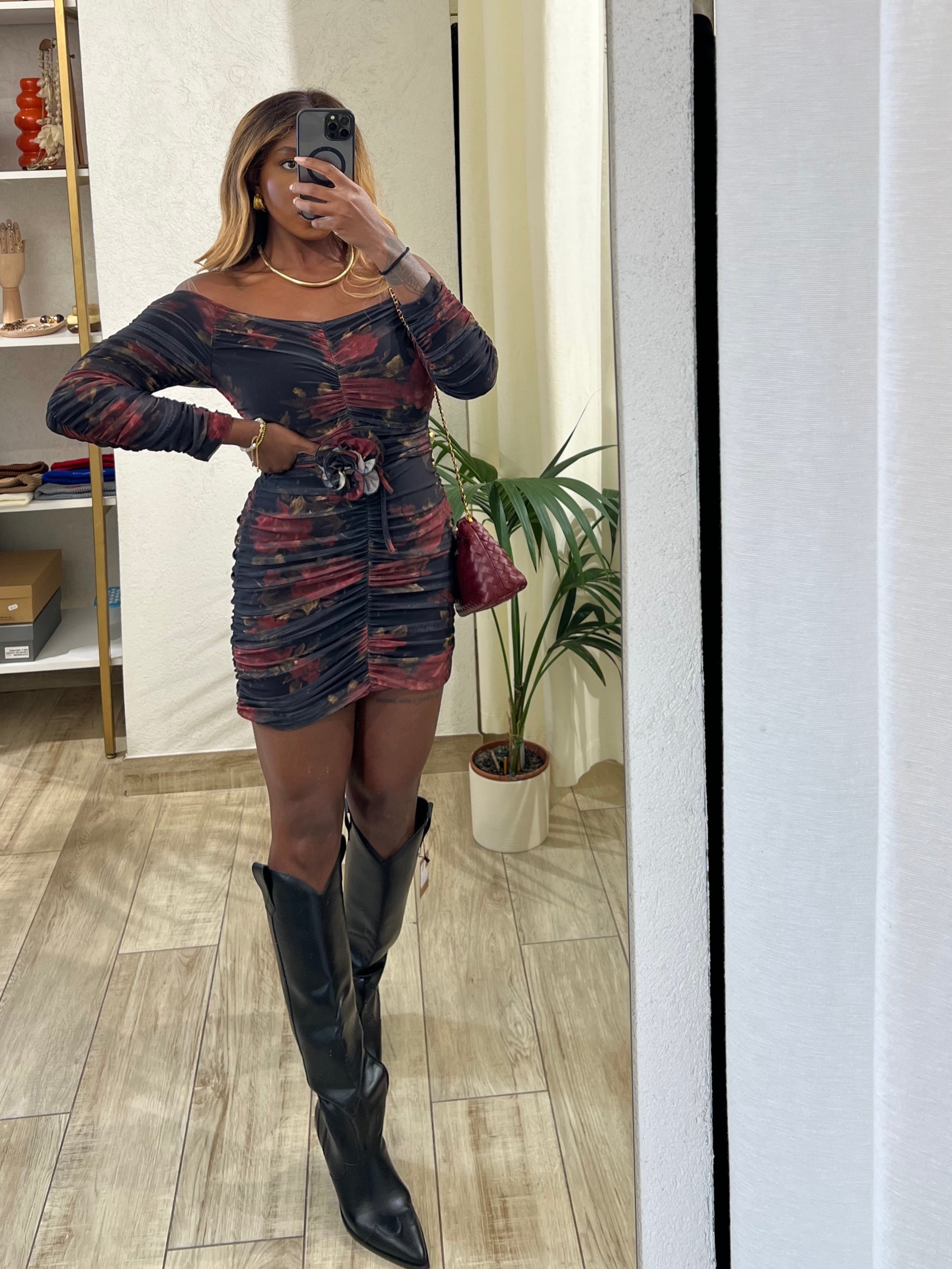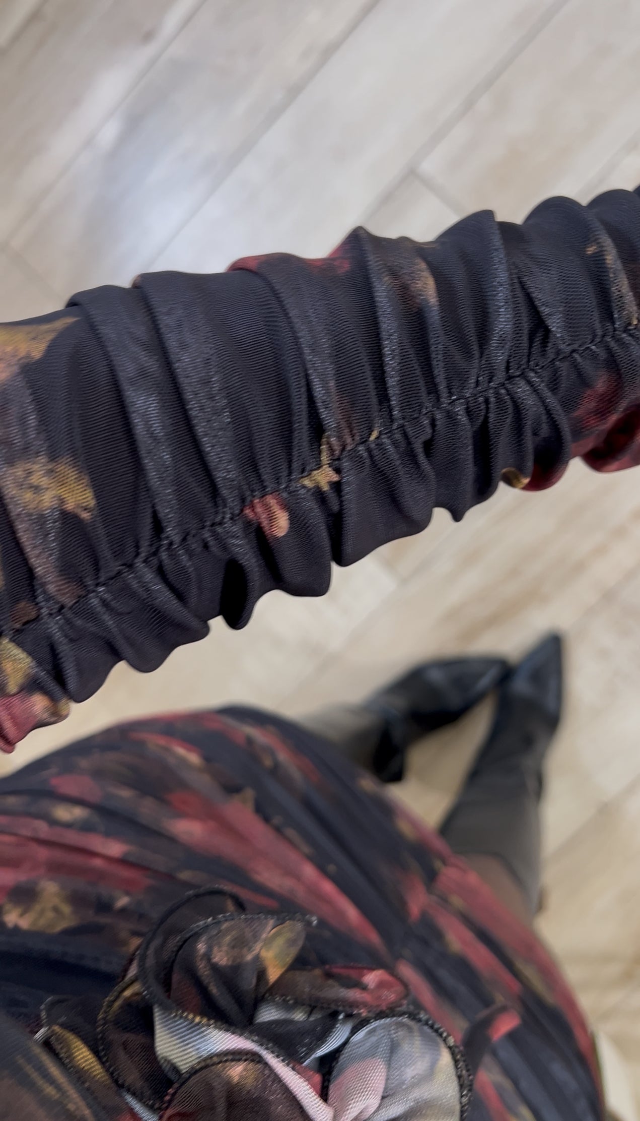 Abito tulle e viscosa con maniche lunghe, modello con drappeggio sia davanti che sul retro , stampa floreale .