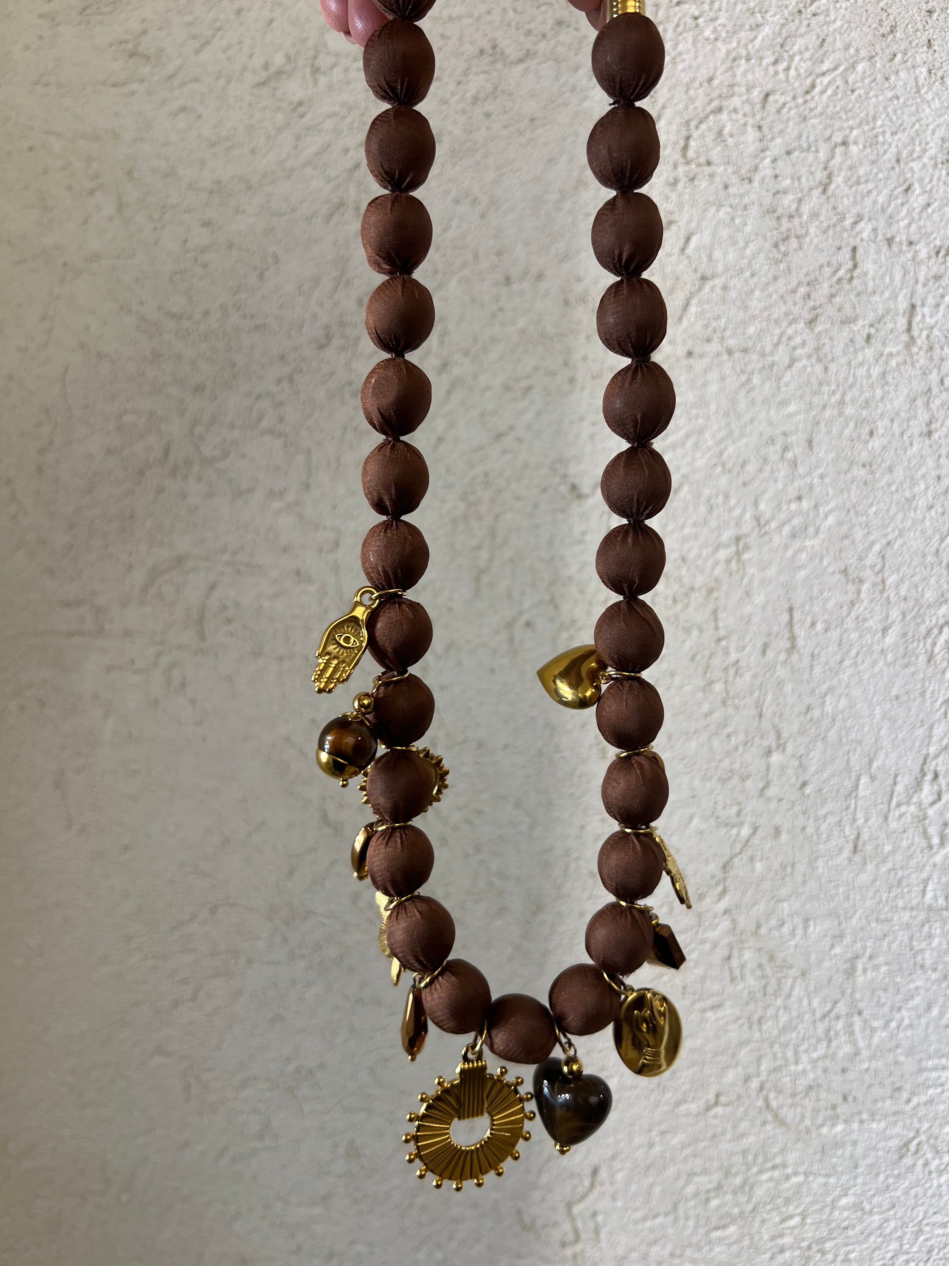 Collana in tessuto con ciondoli oro e pietra dura, chiusura con moschettone