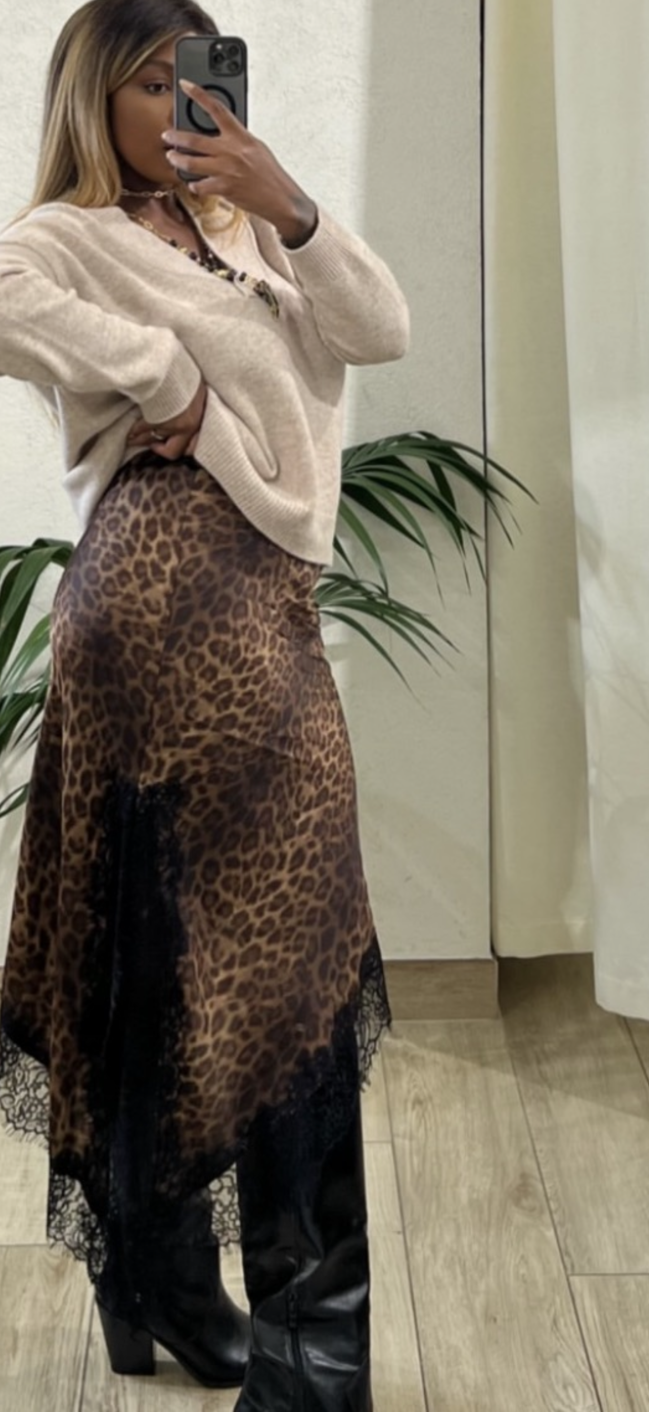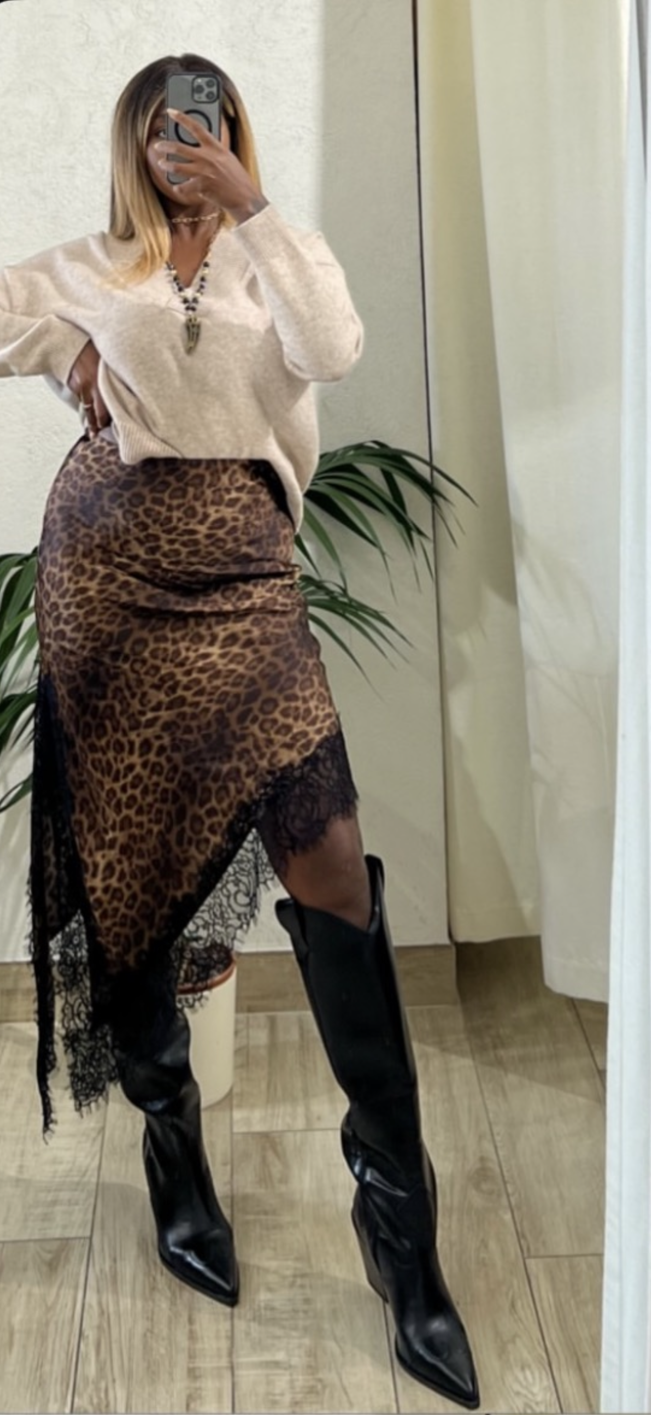 Gonna con elastico in vita , tessuto in viscosa con stampa maculata e pizzo applicato sul fondo.