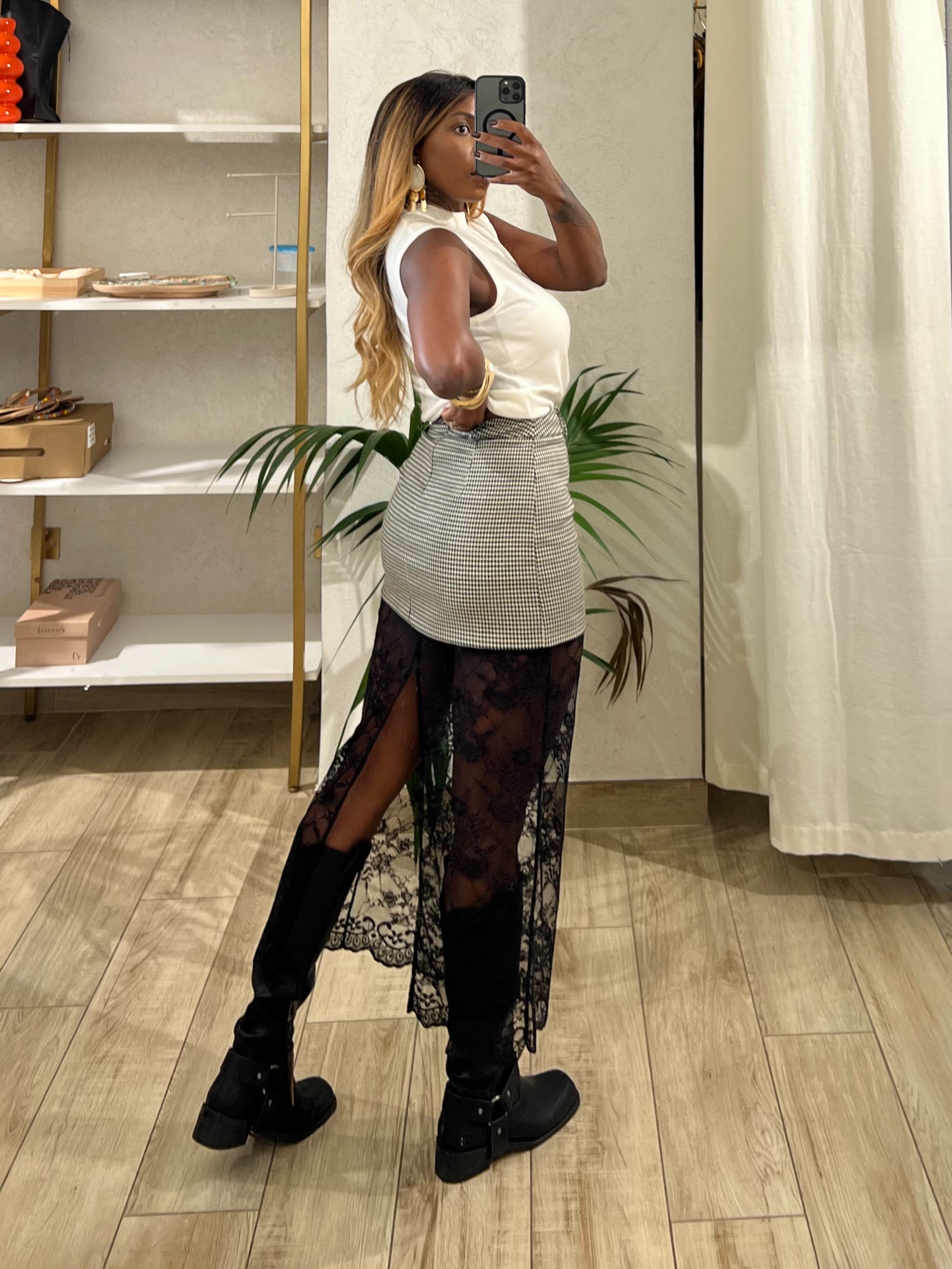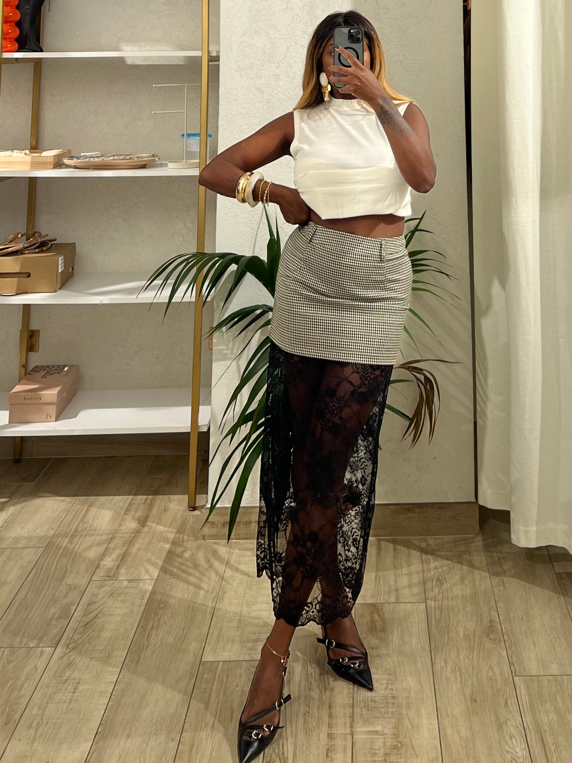 Gonna pied de poule con applicazione in pizzo